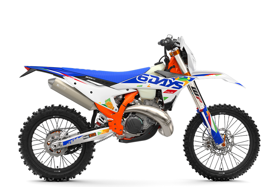 Su parte ciclo está diseñada para ofrecer control, estabilidad y absorción al más alto nivel. Monta un chasis central de acero 25CrMo4 con doble cuna, suspensiones WP XACT Closed Cartridge de 48 mm delante y un amortiguador trasero WP XPLOR con sistema PDS, una combinación que permite rodar con precisión en zonas rápidas, trialeras y tramos rotos. Además, KTM destaca en la versión SIX DAYS un equipamiento especial con llantas GIANT específicas 6DAYS, bujes mecanizados CNC, componentes anodizados, protecciones dedicadas y neumáticos Metzeler 6 DAYS Extreme, reforzando aún más su carácter exclusivo y competitivo.