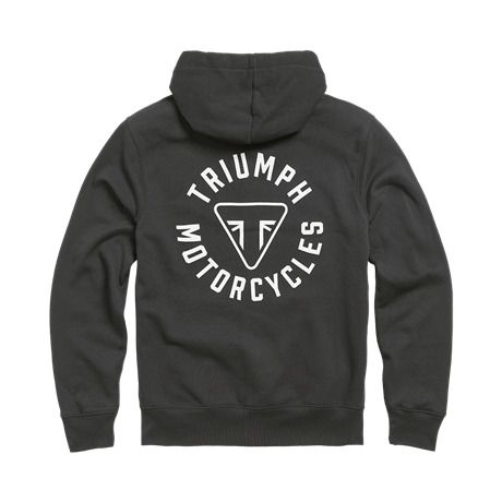 Sudadera con capucha de lana gruesa de algodón en color negro con círculo Triumph Motorcycles en negro, cremallera frontal completa, bolsillos tipo canguro dobles y cordón en la capucha.